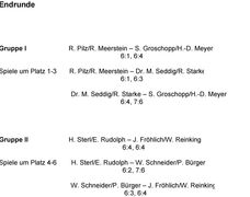 Nach sechs Stunden Spielzeit auf allen drei Plätzen belegte das Dresdner Doppel Ronald Pilz/Rainer Meerstein ohne Satzverlust Platz 1, gefolgt von der Meißner/Freiberger Kombination Dr. Michael Seddig/Rainer Starke, die sich in der Endrunde gegen das Waldheimer Doppel Steffen Groschopp/H.-D. Meyer durchsetzten. Es war mit 6:4, 7:6 ein Kampfspiel.