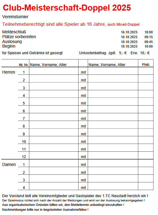 Vereinsturnier für alle Klassen Jugend, Damen und Herren