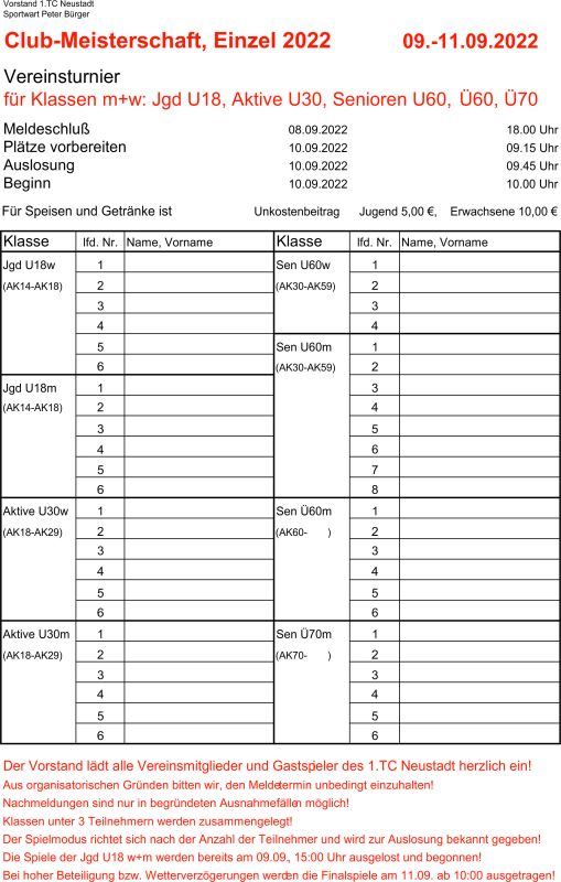 Vereinsturnier für alle Klassen Damen und Herren